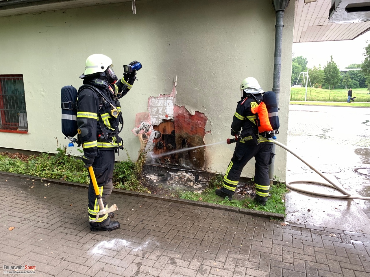 An einer Hauswand brannte eine Mülltonne. Diese konnte durch einen Trupp unter schwerem Atemschutz gelöscht werden. Da nicht auszuschließen war, dass das Feuer auch auf das Gebäude übergegriffen hat, wurde die Fassade sowie und Teile des Dachs geöffnet. Diese Bereiche wurden mit einer Wärmebildkamera kontrolliert, um mögliche Glutnester zu finden.