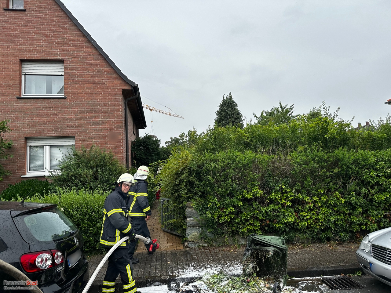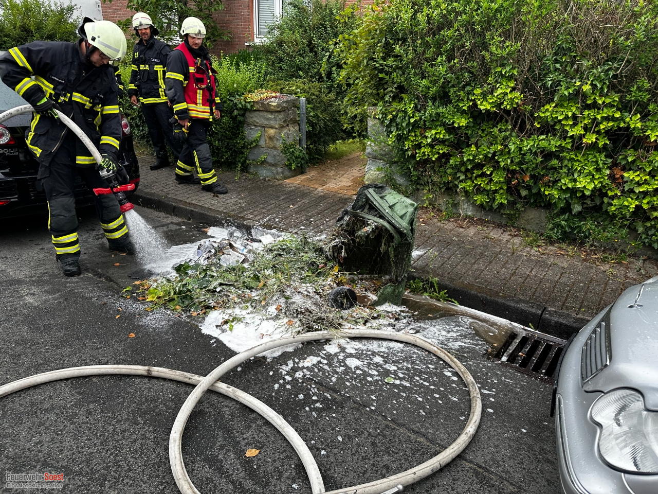 Zu Beginn wurden wir mit der Alarmmeldung "Brennt Wohnhaus" alarmiert. Vor Ort stellte sich dies als drei brennende Mülltonnen am Gebäude heraus. Die Mülltonnen konnten zum größten Teil bereits durch Nachbarn mit ihren Feuerlöschern abgelöscht werden. Zwei Trupps unter Atemschutz brachten die Mülltonnen an die Straße und löschten diese weiter ab. Zusätzlich kontrollierten sie die Fassade auf etwaige Glutnester. Zusätzlich wurde der Dachbereich mit Hilfe der Drehleiter kontrolliert.